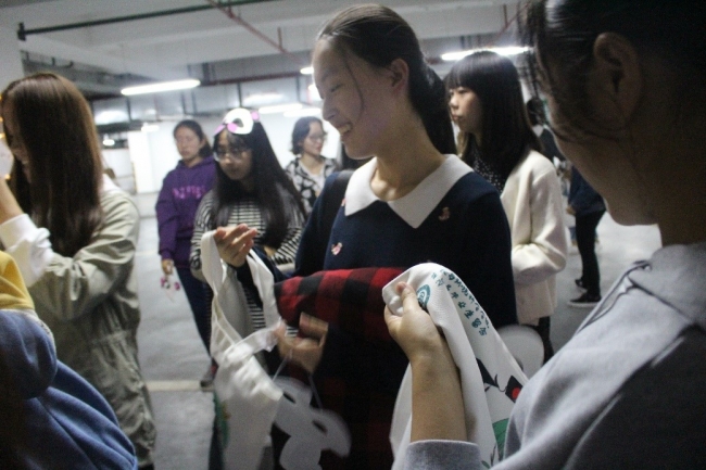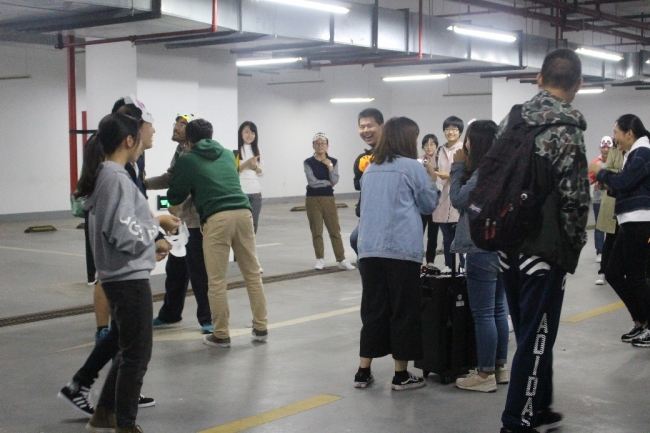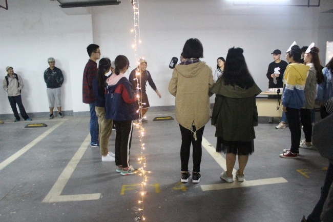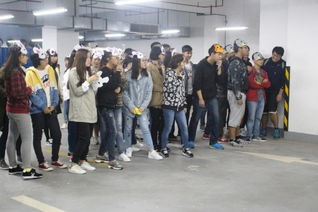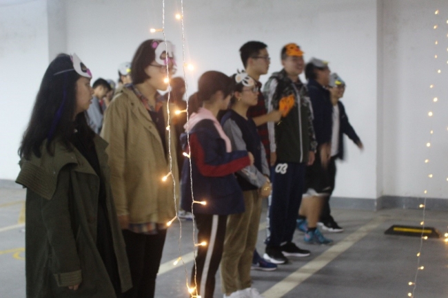 活动开始前,为了考验学导与学弟学妹之间的默契程度,工作人员用一块皮影布将16级和17级的同学分开,学导需要根据幕布上出现的影子识别出自己的学弟学妹,认领错的学导将要接受千斤锤惩罚。紧接着,学导带领着学弟学妹们通过选取动物面具的形式进行分组,选择相同面具的同学分为一组,共分为熊猫、老虎、兔子、大象和奶牛五个队伍。