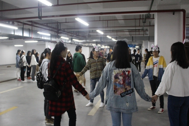 随后,活动正式开始。由两位主持人为大家介绍活动的游戏规则,并希望大家都可以积极踊跃地参与到活动中来。第一个项目是非常经典的萝卜蹲游戏,为了迎合动物面具这一活动元素,在萝卜蹲的过程中还增设了做出代表相应动物动作的要求,增加了游戏的难度。第二个项目是解手链游戏,这非常考验团队的协作能力和肢体活动能力。接着,第三个项目猜歌名将整场活动的气氛推向了高潮,新老生共同猜歌、唱歌,极大地活跃了现场的气氛。紧接着,你演我猜、一块五毛以及不要看这里三项游戏,挑战了同学们的反应能力和模仿表达能力。