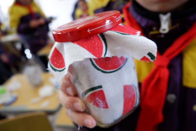课堂一开始,同学们拿出了从家里带来的废弃玻璃瓶,实践部的成员为同学分发了事先准备好的布料与白胶,同时讲师们通过PPT向同学们演示了灯光瓶的制作流程,并向同学们展示了样品。