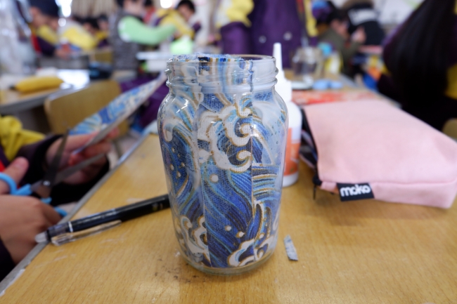 听完讲师的介绍后,同学们便迫不及待地开始了充满奇思妙想的手工操作。先将装饰布裁成想要的形状,再用白乳胶将布条固定在瓶子上,待胶水干后放入节能LED小灯泡,便完成了环保小夜灯的DIY过程。
