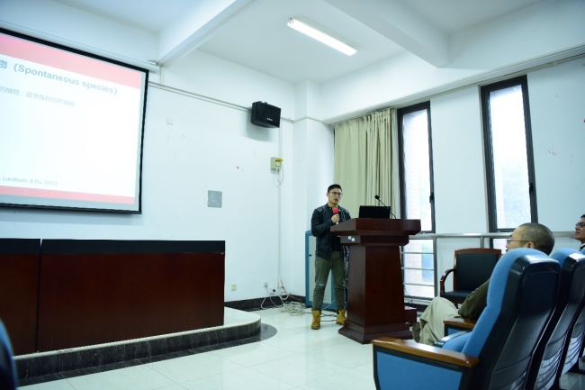 第三位汇报人为来自达良俊老师课题组的高志文同学,他的题目为“昆明城市绿地斑块自生植物物种丰富度成因”。高志文同学今年博士二年级,他本次的报告内容以他在昆明所做的调查研究为重点,沈国春老师和陈小勇老师分别就高志文同学的研究方法进行提问并给出了建议。
