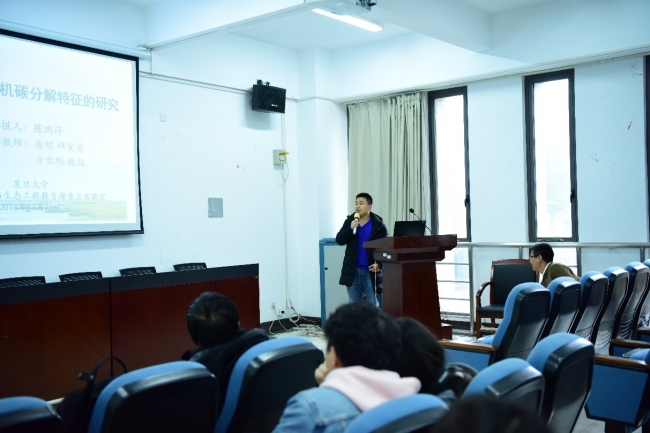 短暂的茶歇后,第六位来自复旦大学聂明老师课题组的陈鸿洋同学带来了他的汇报:“湿地土壤有机碳分解特征的研究”。聂明同学今年博士三年级,此次报告主要汇报了自己的研究进展,夏建阳老师和陈雪初老师给予建议。